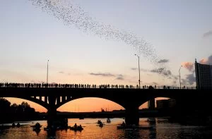 Starting in late March and continuing through early fall, North America’s largest urban bat population calls Austin home. The bats begin to wake up and start their night flight around sunset. The first few bats begin to trickle out from under the bridge then. After the sun sets, the show really begins, and hundreds to thousands of bats pour out and cascade East over Lady Bird Lake.
