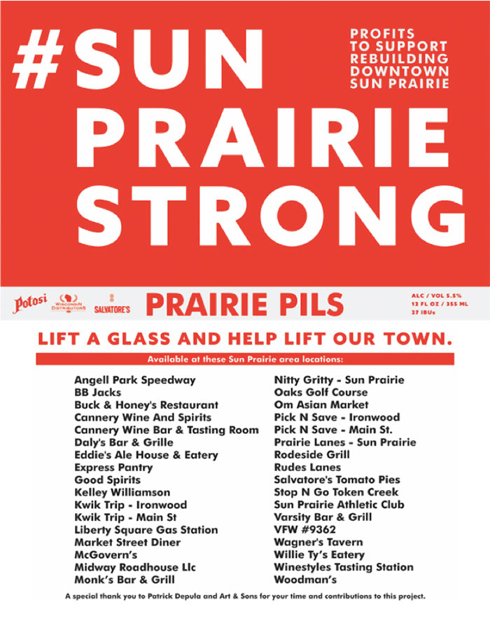 In collaboration with the Sun Prairie Fire Department & the Sun Prairie Community, Wisconin Distirbutors, Salatore’s Tomato Pies – Sun Prairie, and Potosi Brewing Company have partnered together for a commemorative beer release with profits generated by this beer being donated to the Sun Prairie Relief Fund (both by the Brewery and Distributor.) The tragic events of July 10, 2018 will not be forgotten and have changed our community forever. While we know this won’t make everyone whole again, we care about our city and want to do our part to lift everyone’s spirits and bring downtown Sun Prairie back together again.